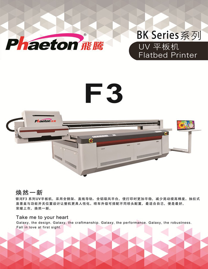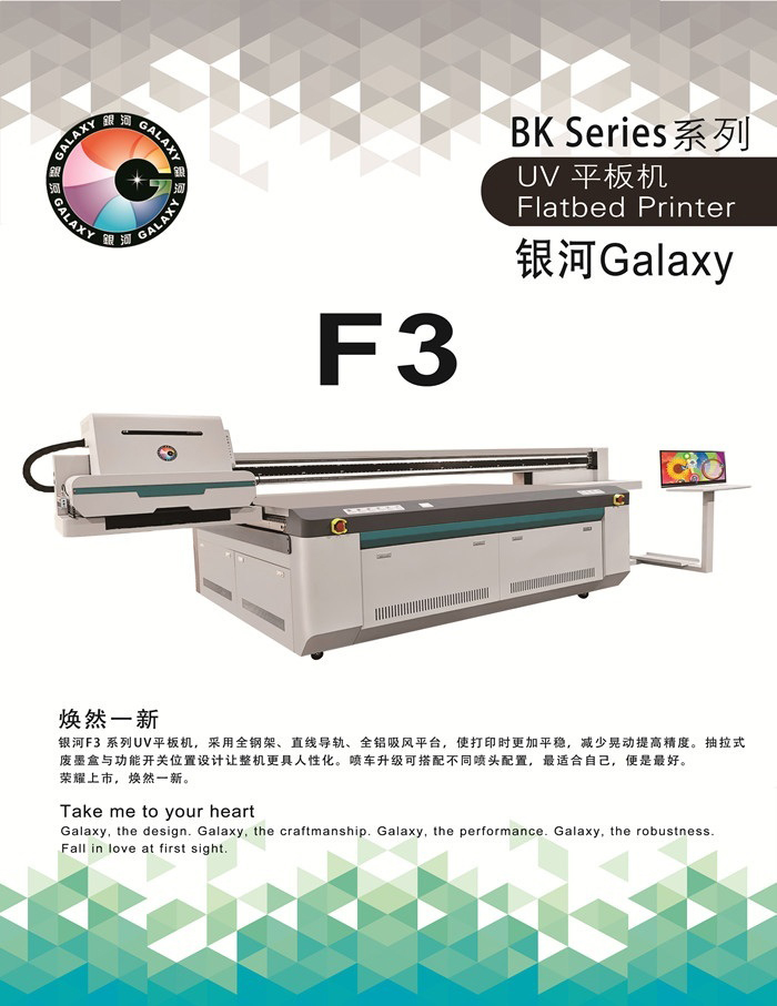 銀河F3系列UV平板機,采用全鋼架、直線導(dǎo)軌、全鋁吸風(fēng)平臺,使打印時更加平穩(wěn),減少晃動提高精度。抽拉式廢墨盒與功能開關(guān)位置設(shè)計讓整機更具人性化。噴車升級可搭配不同噴頭配置,最適合自己,便是最好。 榮耀上市,煥然一新。