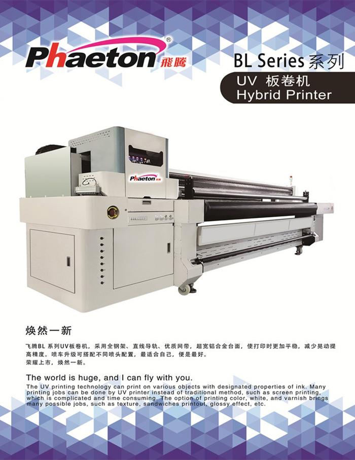 飛騰BL系列UV板卷機,采用全鋼架、直線導(dǎo)軌、優(yōu)質(zhì)網(wǎng)帶,超寬鋁合金臺面,使打印時更加平穩(wěn),減少晃動提 高精度。噴車升級可搭配不同噴頭配置,最適合自己,便是最好。 榮耀上市,煥然一新。