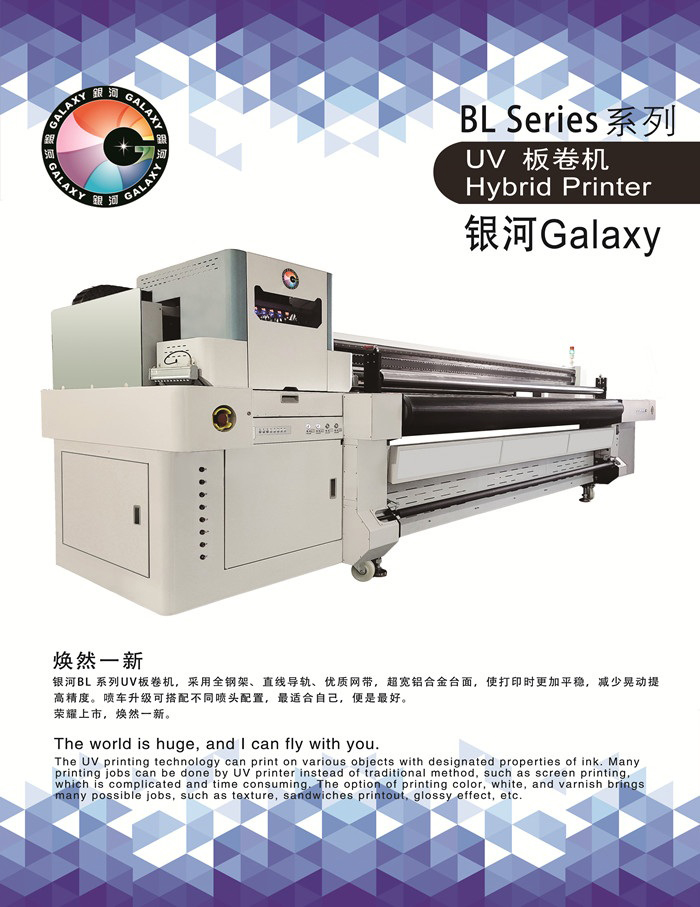 銀河BL系列UV板卷機,采用全鋼架、直線導(dǎo)軌、優(yōu)質(zhì)網(wǎng)帶,超寬鋁合金臺面,使打印時更加平穩(wěn),減少晃動提 高精度。噴車升級可搭配不同噴頭配置,最適合自己,便是最好。 榮耀上市,煥然一新。